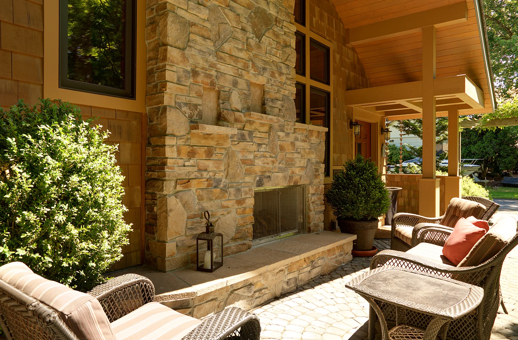 For the Gustaff Residence, we worked within strict zoning criteria and the clients' wish for a home that fits unobtrusively into its setting. The home is submerged under a large shingled roof. The exterior design is an adaptation of the Shingle Style, where a simple skin of wood shingles reveals curvilinear surfaces playing against simple geometric volumes.